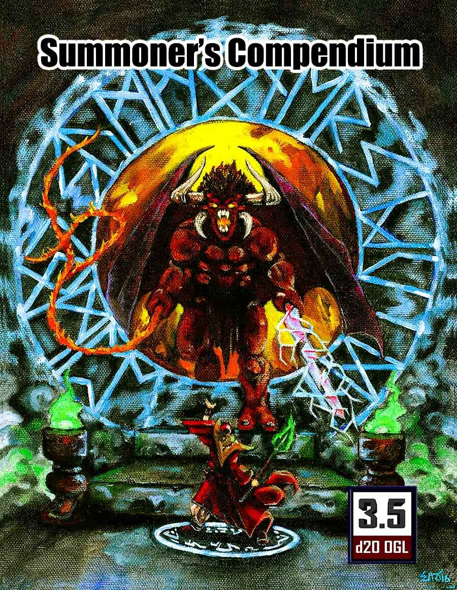 Summoner’s Compendium (3.5 Edition) is a 358-page book containing 277 creatures from the Conjuration subschools (Calling, Creation, and Summoning) spells. Creatures summoned under the subschool (Summoning) have Augmented Summoning, Celestial, and Fiendish template stats added to them. For summoned allies with Battle Frenzy or Rage, those bonuses and penalties have been added as well. There is nothing to add or take away from any of the creatures. This task has been done for you. Each creature has its own stats and illustrations. So, enjoy the comfort of having all the information available for you on one designated creature page. Simply turn to that summoned creatures page, and that creature is ready to use. Summoning has never been easier, than with the Summoner's Compendium.