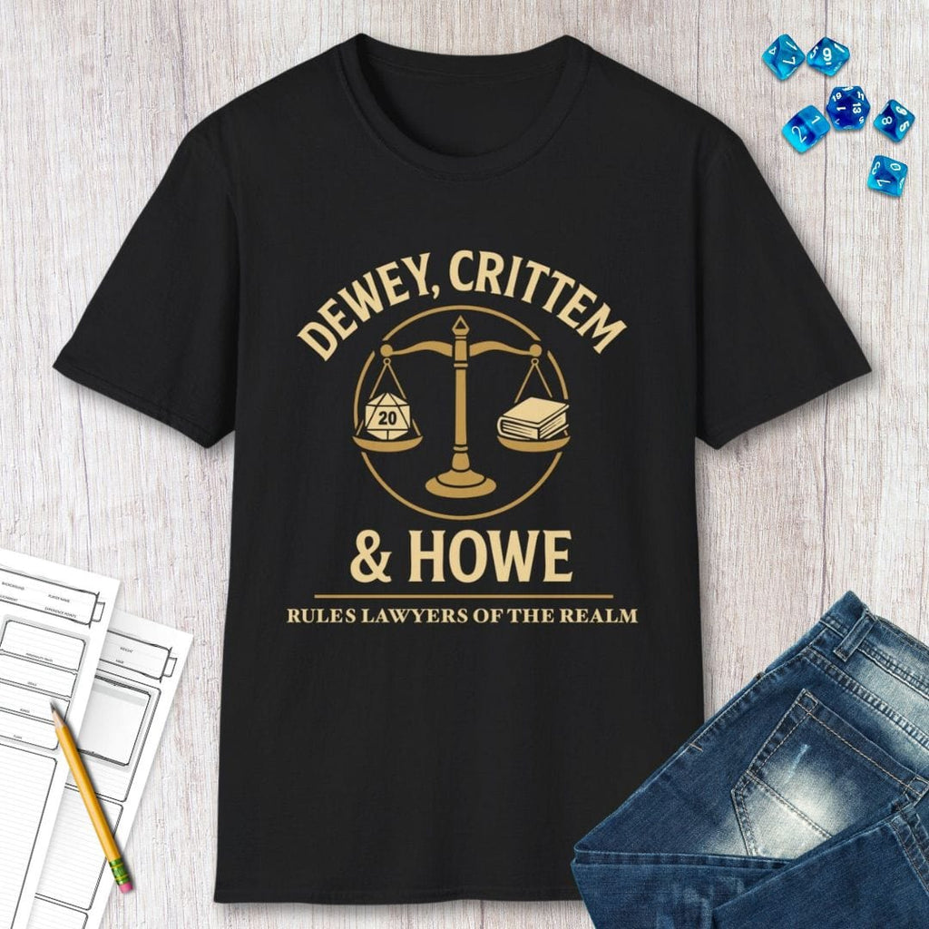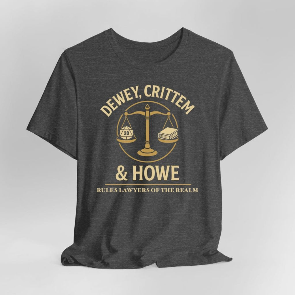 Welcome to the most prestigious law firm in all the realms: Dewey, Crittem & Howe – Rules Lawyers of the Realm. Whether you're defending your spell slot usage, citing the PHB during initiative, or simply love poking your DM with technicalities, this shirt is your badge of honor.