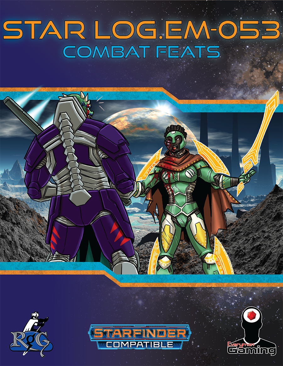This installment of Star Log.EM includes: 1,000 words introducing over 10 all-new combat feats for the Starfinder Roleplaying Game! Within, you’ll find feats that allow your character to rapidly strike in a cone with a melee weapon, threaten foes with your ranged weapons, pool the damage from multiple attacks together into a devastating blow, and more!