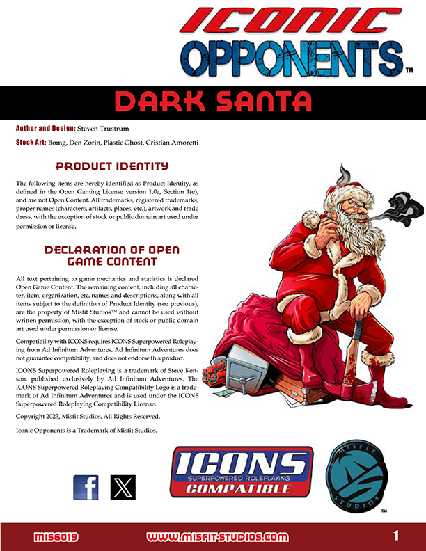 This Iconic Opponents release presents Dark Santa, a malevolent version of Santa from another dimension. Seeking to harm children rather than bring them joy and holiday cheer, Dark Santa is served by his doomdeer and frigid "Frosties" minions.
