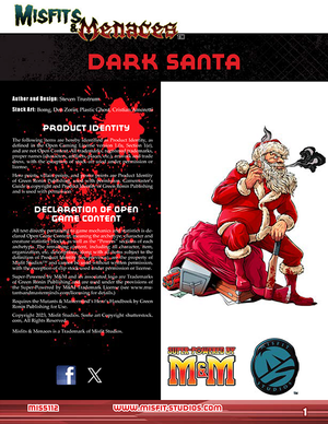 This Misfits & Menaces release presents Dark Santa, a malevolent version of Santa from another dimension. Seeking to harm children rather than bring them joy and holiday cheer, Dark Santa is served by his doomdeer and frigid "Frosties" minions.