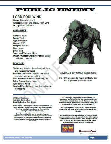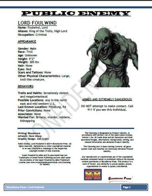 Each issue of the Public Enemy series introduces one super villain from M.E.T.A. Force and includes an overview of their origin, personality, goals, methods, enemies, allies, and combat tactics. Each installment also includes story ideas and M&M stats so you can add these nefarious and sinister characters to your own games. This Issue: Lord Foulwind and Redfang– A fearsome (or bumbling) pair of monsters from another world, Lord Foulwind and his goblin sidekick, Redfang, have come to this world to build a kingdom. A powerful sorcerer, the Troll King uses his magic to blast, burn, beguile, or entrap his adversaries, or to enhance his own already formidable physical abilities, turning himself into an unstoppable tank... with one secret weakness. What’s Included: