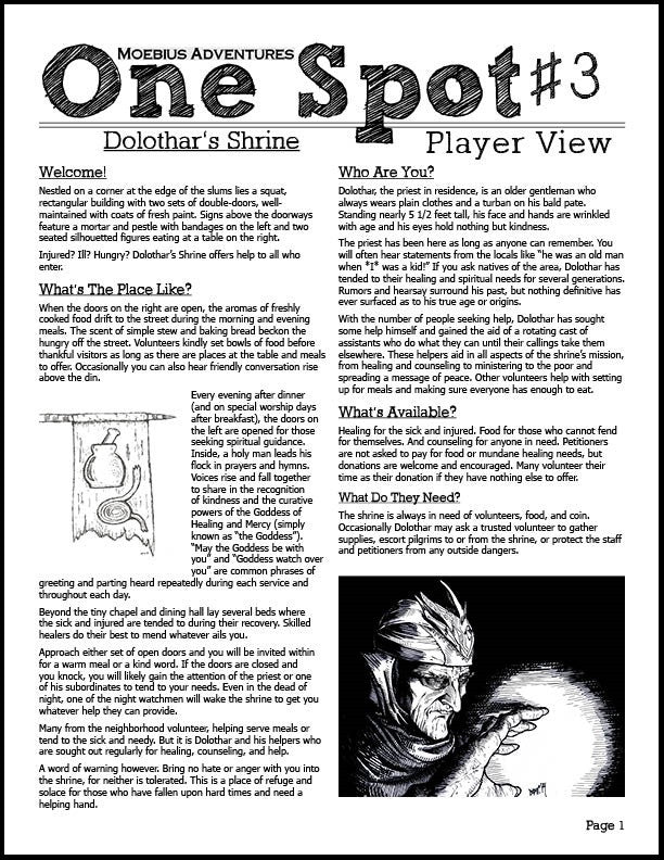 One Spot #3 presents a small shrine to a god of healing dedicated to helping the poor people of town, complete with a mysterious priest (Dolothar) with his helpers, building map, images, and more. One Spot #3: Dolothar's Shrine is another great tool to include in your bag of GM tricks!