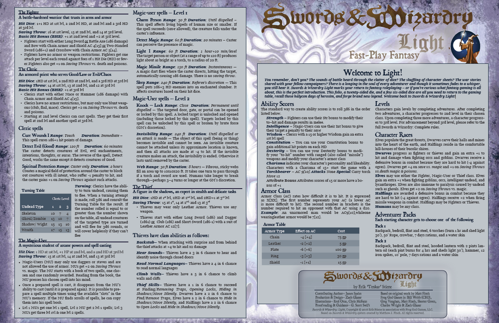 You remember, don’t you? The sounds of battle heard through the clatter of dice? The shuffling of character sheets? The war stories shared with your fellow campaigners? There is a longing in the soul of every adventurer and though it sometimes fades to a whisper, you still hear it. Swords & Wizardry Light marks your return to fantasy roleplaying – or if you’re curious what fantasy gaming is all about, this is the perfect introduction. This folio, a twenty-sided die, and a few six-sided dice are all you need to return to the gaming table, recall those halycon days of herosim, and forge brand new legend. Welcome back to Swords & Wizardry Light!