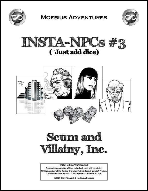 Like all Moebius Adventures supplements, Insta-NPCs #3: Scum and Villainy, Inc. is designed to be system- and genre-neutral. This 8 page PDF includes five tables with examples, a worksheet, some guidance on creating villainous groups, and a small organization you can use right away.