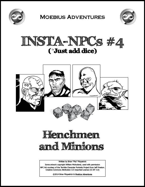 Like all Moebius Adventures supplements, Insta-NPCs #4: Henchmen and Minions is designed to be system- and genre-neutral. This 7 page PDF includes three (with a bonus) tables with examples, a worksheet, some example henchmen from the silver screen, and four unique NPCs (with portraits) from different genres you can use right away.