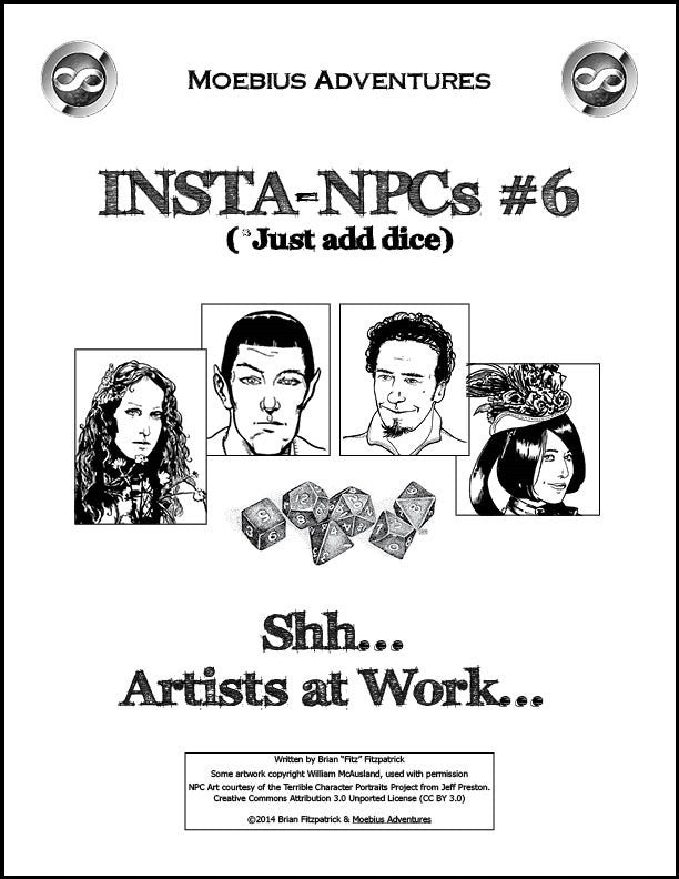 Like all Moebius Adventures supplements, Insta-NPCs #6: Shh... Artists at Work... is designed to be system- and genre-neutral. This 13 page PDF includes nine tables with examples, three worksheets, some examples, and four unique NPCs (with portraits) you can use right away.