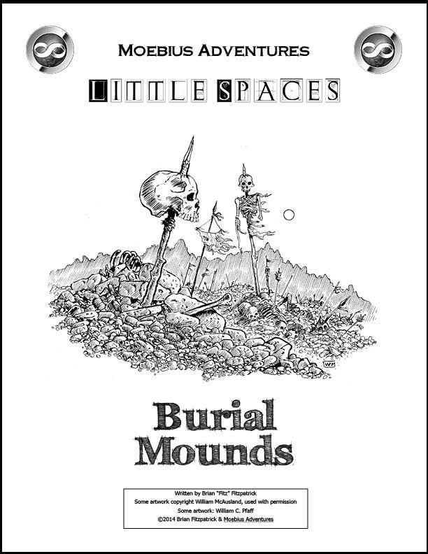 Little Spaces: Burial Mounds takes a different approach to graveyards than Little Spaces: Gruesome Graves. Taking a lesson from the Insta-NPCs series, Fitz has changed up the format slightly going away from the Senses, Descriptive Element, and Sense Descriptor methodology to a more free-form collection of tables. In Burial Mounds you get eight separate tables helping you determine what your burial mound, mausoleum, or gravestone might look like.