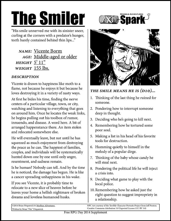 Free RPG Day is upon us! Huzzah! And to dampen your spirits, I release The Smiler upon the worlds...