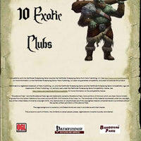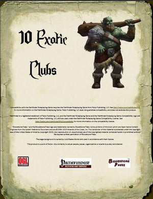 This File Features 10 New Magical Clubs For Use With The Pathfinder Roleplaying Game. These clubs range in value from 9000 gp to 40,000 gp, making them ideal for mid level gaming. Each club features a unique array of powers including several that are useful outside of combat.
