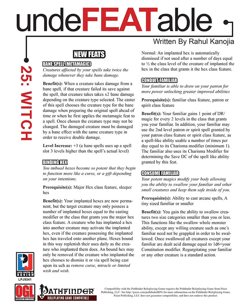 Undefeatable is the new supplement line for fans of The Pathfinder Roleplaying Game who are looking to add more interesting a different feats to their gaming sessions. Undefeatable 25 which focuses on Witch has nearly 25 feats including Binding Hex, Consume Familiar, Hex Burn, Implant Hex, Weakening Hex and Vexing Spell that are perfect to be used in any game setting. This 5 page PDF is just the sort of thing needed for GMs to add depth to any great Pathfinder Roleplaying Game gaming session.