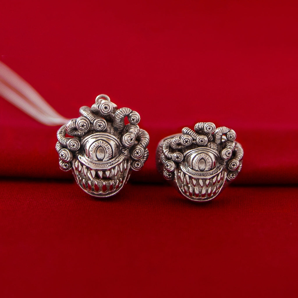 Handcrafted in sterling silver and antiqued to accentuate the incredible detail, the Beholder Necklace is intricately sculpted in frightening glory. With unmatched realism, ten eyestalks writhe above one central eye, and the round body is covered in a pebbly skin texture. A ghoulish grin filled with wickedly hooked teeth captures the essence of this infamous aberration.