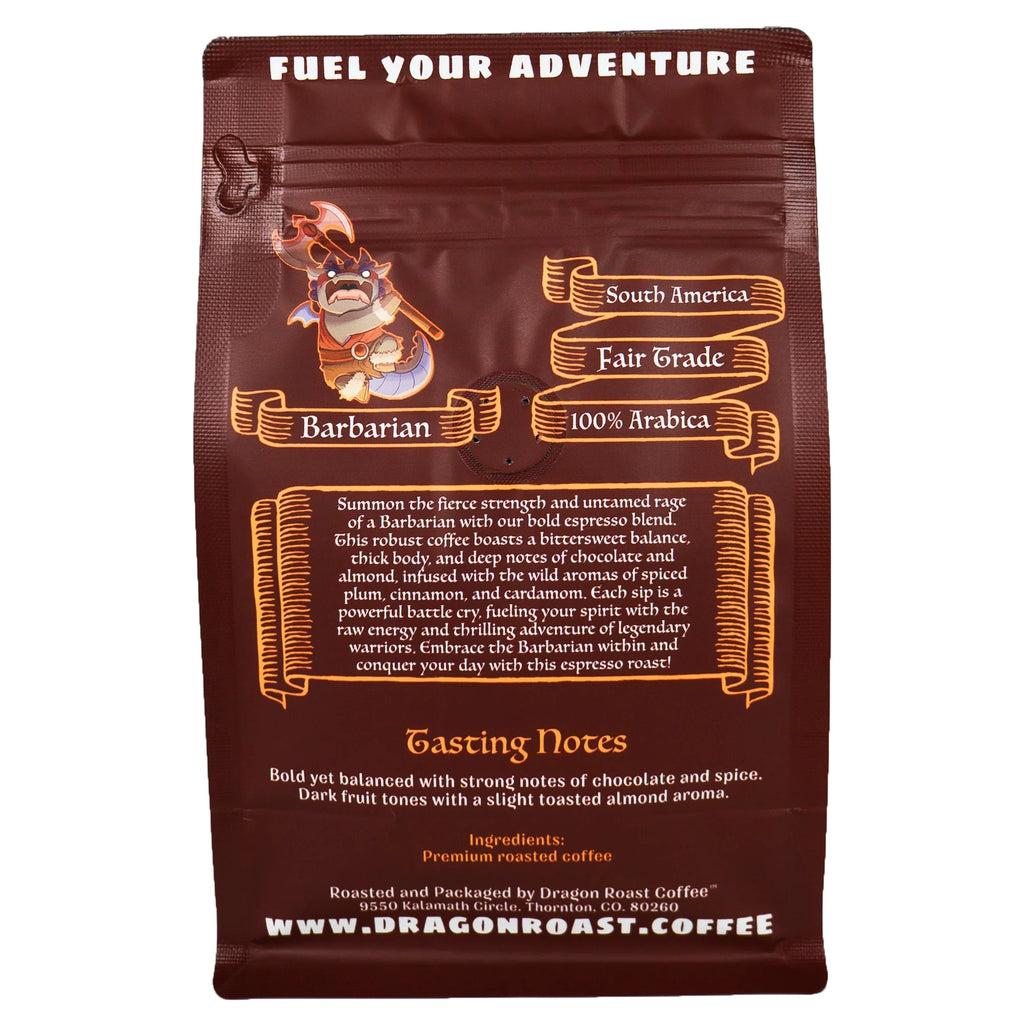 Summon the fierce strength and untamed rage of a Barbarian with our bold espresso blend. This robust coffee boasts a bittersweet balance, thick body, and deep notes of chocolate and almond, infused with the wild aromas of spiced plum, cinnamon and cardamom. Each sip is a powerful battle cry, fueling your spirit with the raw energy and thrilling adventure of legendary warriors. Embrace the Barbarian within and conquer your day with this espresso roast!