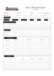 This worksheet is an expanded, fillable, and savable version of The Pathfinder Roleplaying Game's Settlement Sheet. Like other NSN products it's the final design of several game masters and player's comments. It is also complete with Adobes Reader Extended Features so that you can save your data and work on it again later.