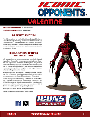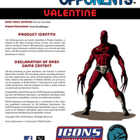 This Iconic Opponents release presents Valentine, a victim of alien aggression who used his contacts in American alphabet agencies to acquire a nanite battlesuit. He now indiscriminately hunts and kills aliens to protect humanity, no matter what the extraterrestrial's actions or intentions may be.