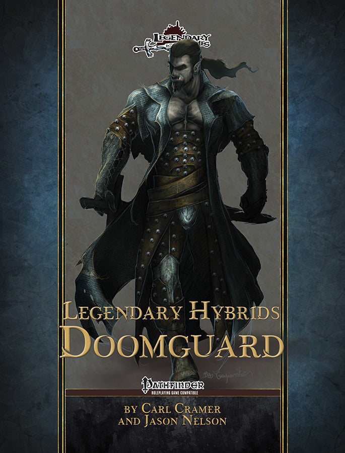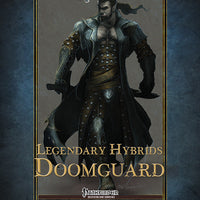 Legendary Hybrids: Doomguard is the latest volume in our series of class-focused player supplements, introducing a new series of hybrid classes like those in the Pathfinder Roleplaying Game Advanced Class Guide that blend the core elements of two different base classes into a unique synergy all their own. The Doomguard brings you a 20-level hybrid class that combines the deadly hunting skills, specialized combat prowess, and focused wrath of the ranger with the glorious defiance and battlefield of the cavalier, with a special twist: a terrible and dire doom that follows him like an oracle's curse and binds him to his fated enemies at whose hands he is doomed to die! You can select from 45 different dooms, from maimed and blinded to powerless prophet and stigmata! You'll also find favored class bonuses for core races and a quartet of amazing archetypes, from the dauntless and daring challenger, the defensive bulwark of the doomwarden, the fey foundling orphan with a forgotten lineage but connections to the mystical world of the fey, and the dread raven banner with a death wish that defies all who stand in his path. If you've ever wanted to play a warrior with a dark destiny crawling from behind and even as it drives him onwards to meet his fate for death or glory, pick up this 38-page Pathfinder character class supplement today and Make Your Game Legendary!