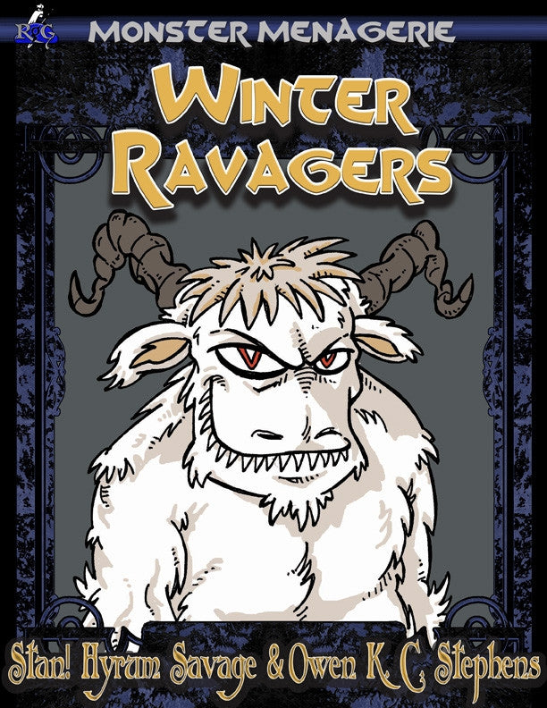 Welcome to Winter Ravagers, the first in Rogue Genius Games' Monster Menagerie line of monster products. The plan is for every Monster Menagerie to offer a set of monsters that match a theme, with full write-ups, simple index card style summaries for use at the game table, and printable standee figures for every monster. But while future versions will feature typical fantasy adventure themes-fiends and cultists, dark fey, creatures from the subterranean kingdoms - Winter Ravagers is focused on a less common trope.