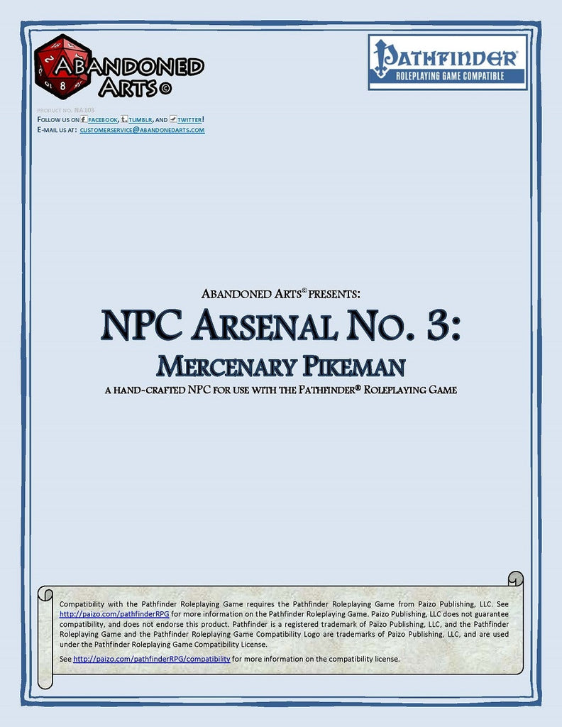 NPC Arsenal No. 3: Mercenary Pikeman features a frustratingly defensive human fighter designed to keep opponents at arm's length, unable to strike back.