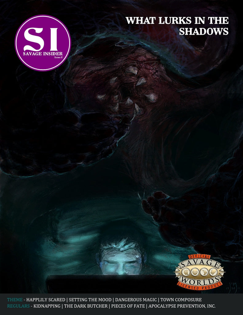 Savage Insider Issue 3: What Lurks in the Shadows is a dark, gritty-themed issue with a look at the more horrific side of games. The pillar article Happily Scared is a lengthy discussion about what makes horror so appealing while Dangerous Magic introduces a grittier theme to your game’s magic mechanics.