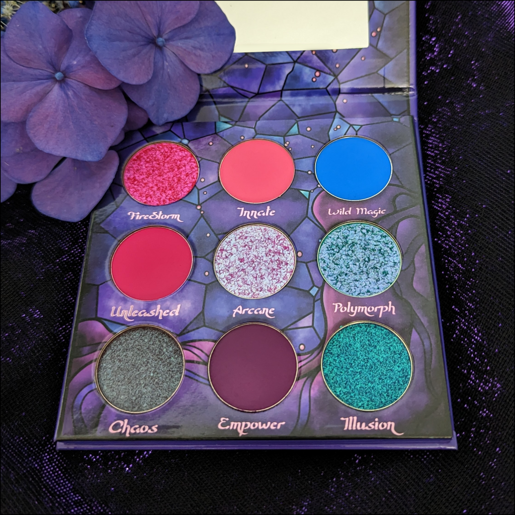 The Sorcerer palette has 9 pigmented shades including 4 mattes, 1 duo chrome, and 4 multi chromes.