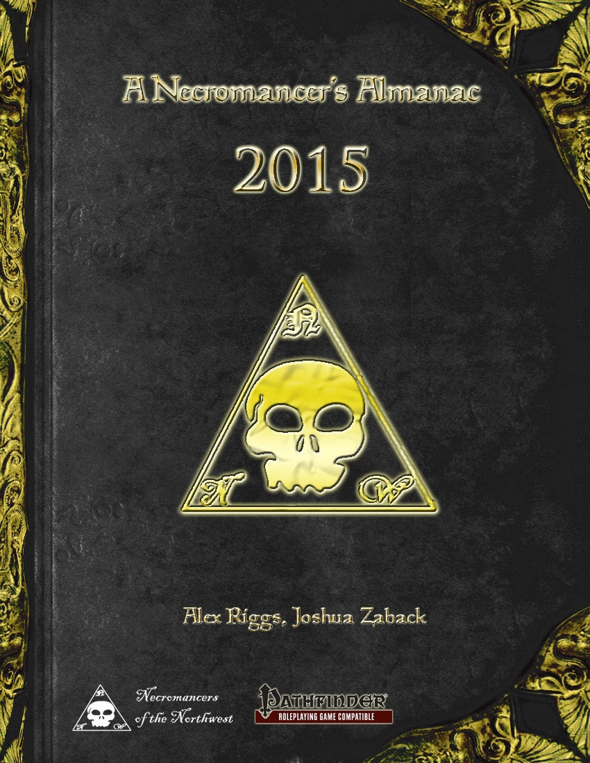 A Necromancer’s Almanac: 2015 is a compilation of all the material produced in 2015 for Necromancers of the Northwest’s popular article lines Best in Class, Obscure Arcana, Magic Market, and Exotic Encounters, plus a few additional extras scattered in. With over 180 pages of gaming content, it’s not hard to believe that this book was a full year in the making.