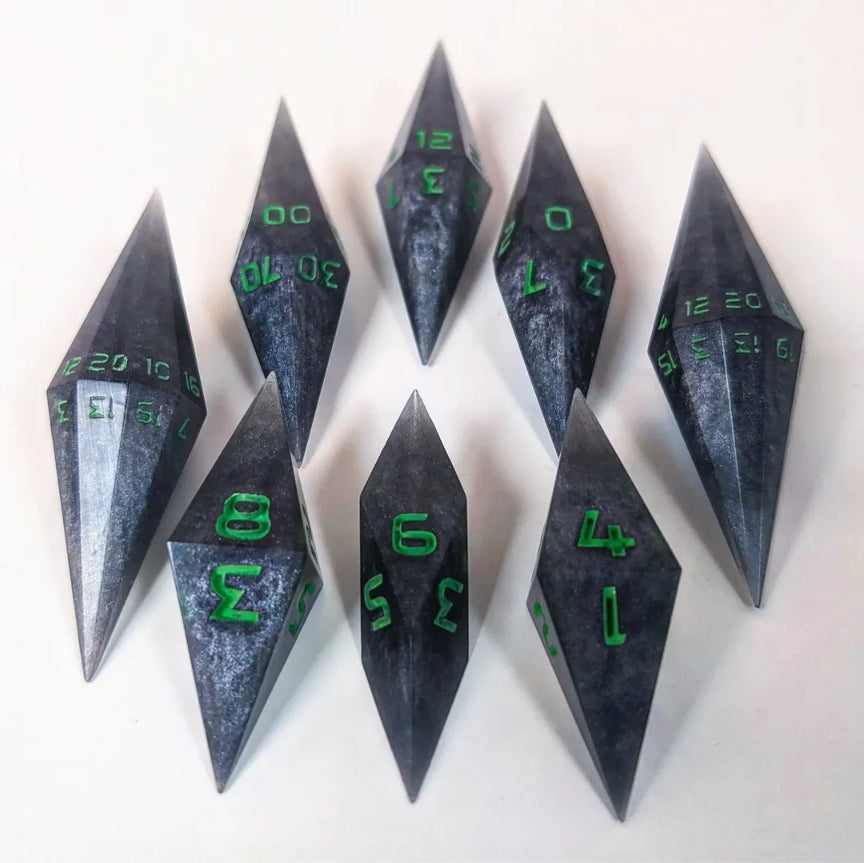 Deep charcoals and swampy hues swirl with menace, while green numbering hints at the sting of corrosive breath. These diamond-shaped dice carry the lurking weight of something ancient and patient.