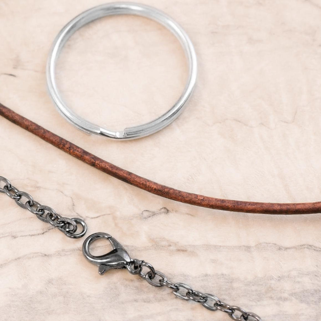 - Choose charm by itself, keyring, 30" plated steel chain with lobster clasp, certified nickel-free OR 30" leather cord