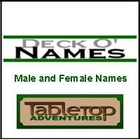 Now produce quick, reasonable and unique names for your characters or NPCs with the fun name generator, the Deck O' Names. The cards can be used by a player who is having trouble finding a name for a character, or GMs can generate names on the fly. The Deck can be used to develop names in advance, to have some available during a gaming session, or set it beside your notes to play with as conversations develop.