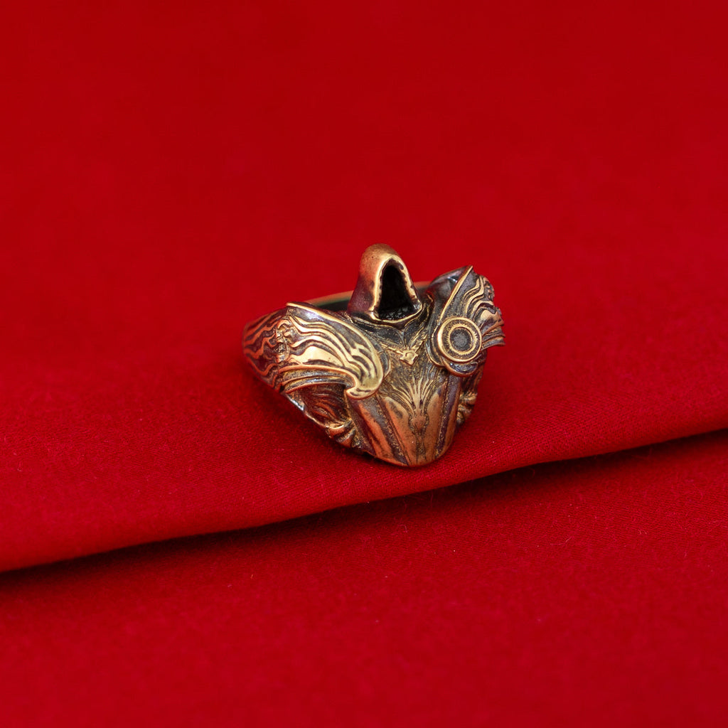 Handcrafted in artisan brass, this piece captures the ominous and faceless bust of Inarius as a statement ring. With an antiqued distressed finish to match the embellishments of his armor, Inarius’ hood, pauldrons and chest plate are represented in sculpted durable detail. Within the inner band is engraved: “BASK IN HIS GLORY.” A three-dimensional ring, the domed body is hollowed beneath for comfortable wear.
