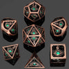 Behold the Dragon's Eye Hollow Metal Dice Set, where ancient copper meets the mesmerizing allure of emerald green gems. These 7 polyhedral dice aren't just game pieces; they're miniature treasures, each one a portal to realms of fantasy and adventure.