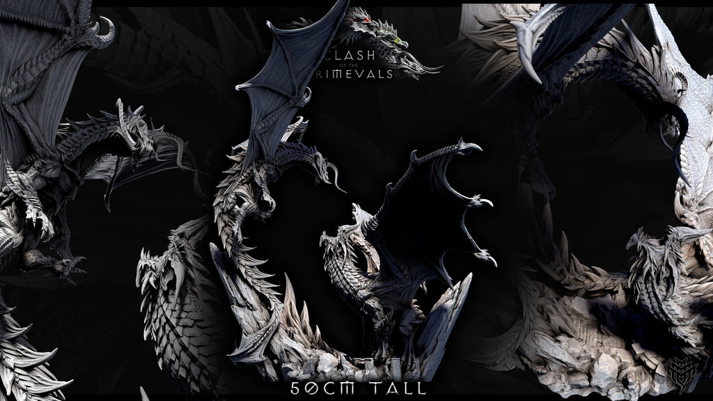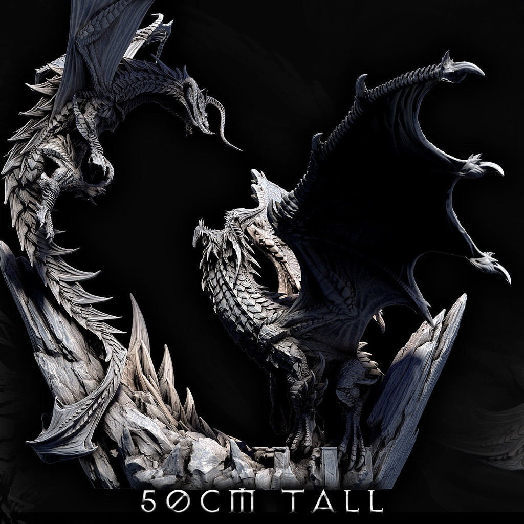 Witness the ferocity of the Elder Black Dragon and Elder Blue Dragon locked in a sky-shattering duel above jagged cliffs. This 50cm tall diorama captures every scale, wingbeat, and lethal strike—perfect for Dungeons & Dragons, Pathfinder, or any fantasy TTRPG centerpiece of ancient draconic rivalry.