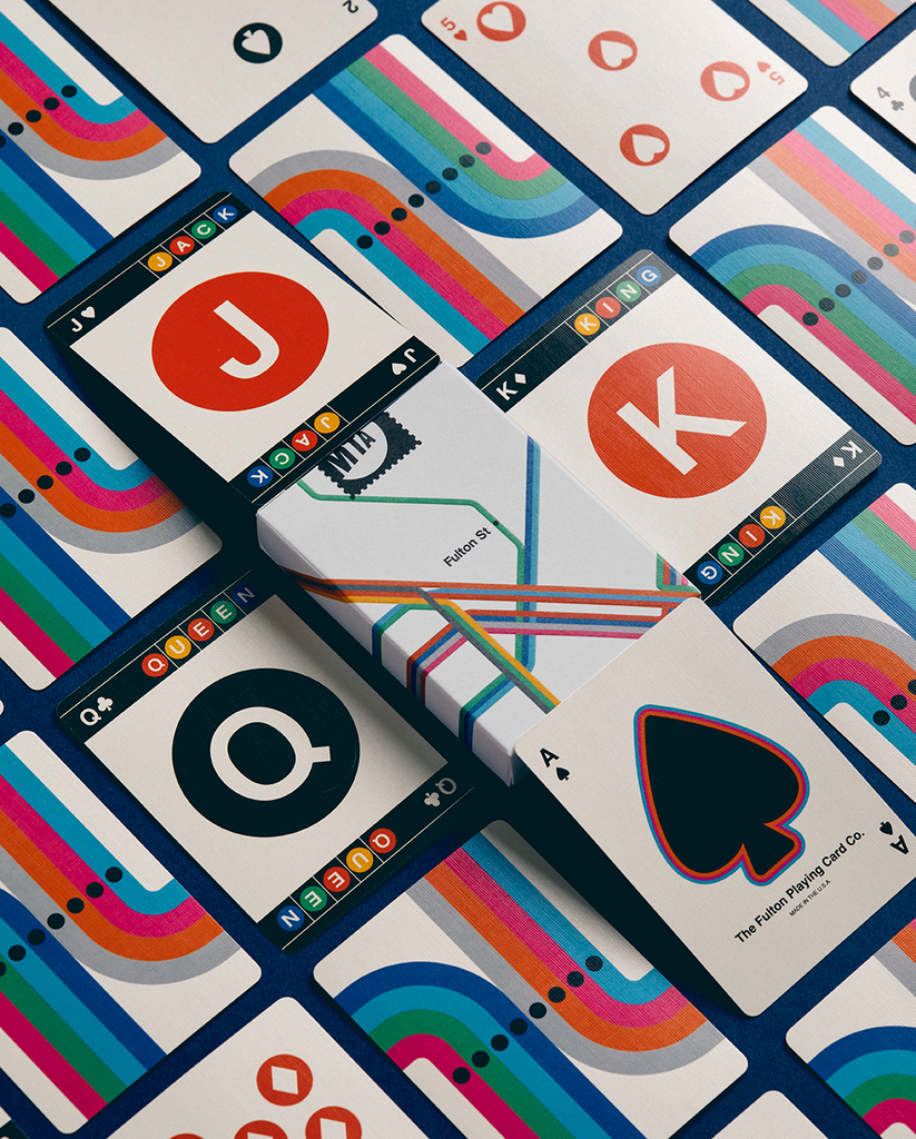 Fulton Street Playing Cards is a love letter to the amazing graphic design of the New York Metropolitan Transportation Authority. By “cropping into” the curves so eloquently designed by Vignelli, these cards provide a back design that encapsulates the kinetic energy of transit in The Big Apple.