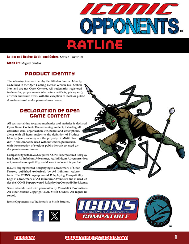 Iconic Opponents: Ratline presents a criminal descended from a family of smugglers and human traffickers. Ratline can use his global criminal network to help fugitives escape from just about anywhere or sell human flesh cheaply. He is a low-level telekinetic who uses his power to enhance his deadly martial arts, especially when it comes to whipping about or swinging from his rope dart.