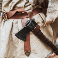 Norse Tradesman's premium cowhide axe holster will compliment almost any Viking outfit. However, this is no costume prop. Totally handmade, each ax holster is an example of Norse Tradesman's fine craftsmanship. You won't find a better quality weapon accessory anywhere near this price point. We have sworn a solemn vow to provide authentic Viking handcrafts at reasonable prices so that everyone who so chooses can channel their inner heathen.