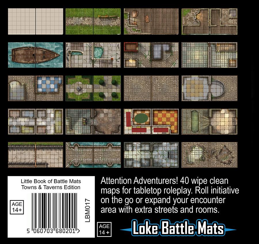 The Little Book of Battle Mats - Towns & Taverns Edition is the book of lay flat wipe clean RPG Battle maps that fits in your pocket! Suspicious Rooms, Alley ways, Bridges and Cellars can now appear in moments just where you need them so you are always ready to roll!
