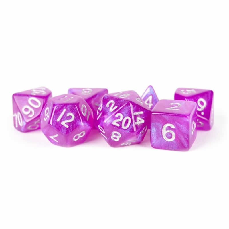 MET179 Purple Stardust Resin Dice with Silver Numbers 16mm (5/8in) 7-Dice Set Metallic Dice Games