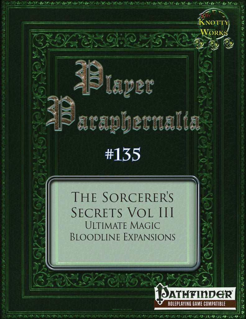 Welcome to issue #135 of the Player Paraphernalia series. This issue continues the options regarding Sorcerer bonus bloodline spells presented in Player Paraphernalia #133. Rather than just a single spell gained per level, the sorcerer may choose from a limited list of spells. Two options are presented in managing the inclusion of this bonus spell option. All seven of the bloodlines presented in the Pathfinder Roleplaying Game Ultimate Magic™ are included in this issue.