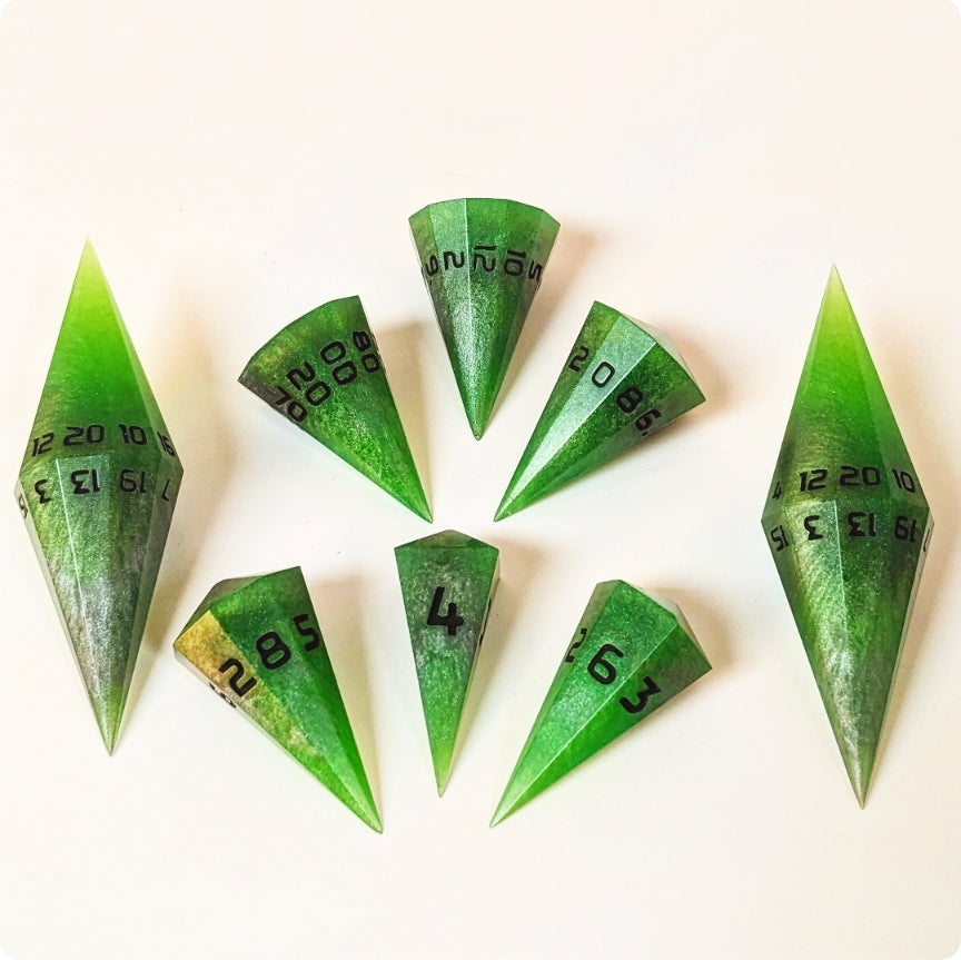 Toxic greens and dark undertones blend like bubbling venom in a glass vial. Their sleek, dagger-like silhouette adds danger to every roll.