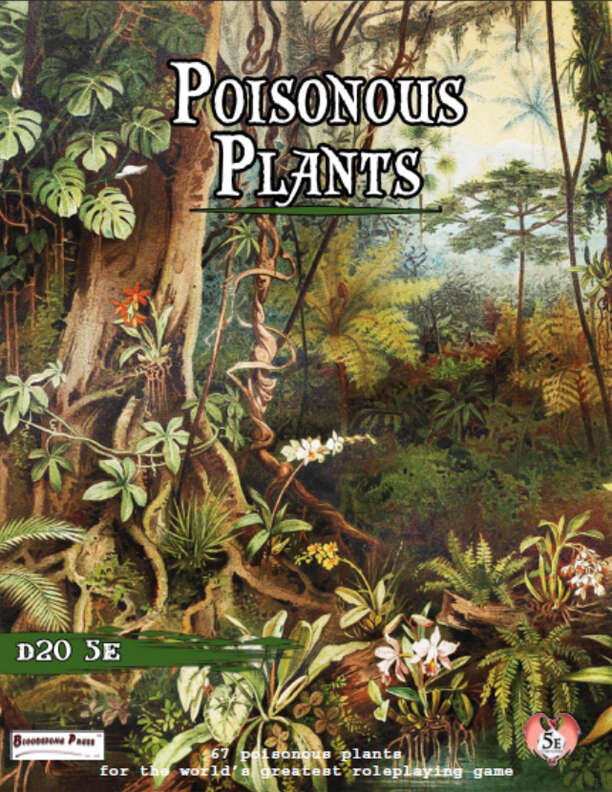 Poisonous Plants features 5th edition D20 rules for sixty-six deadly plants and one ooze from our own world including hemlock, nightshade, and hellebore.