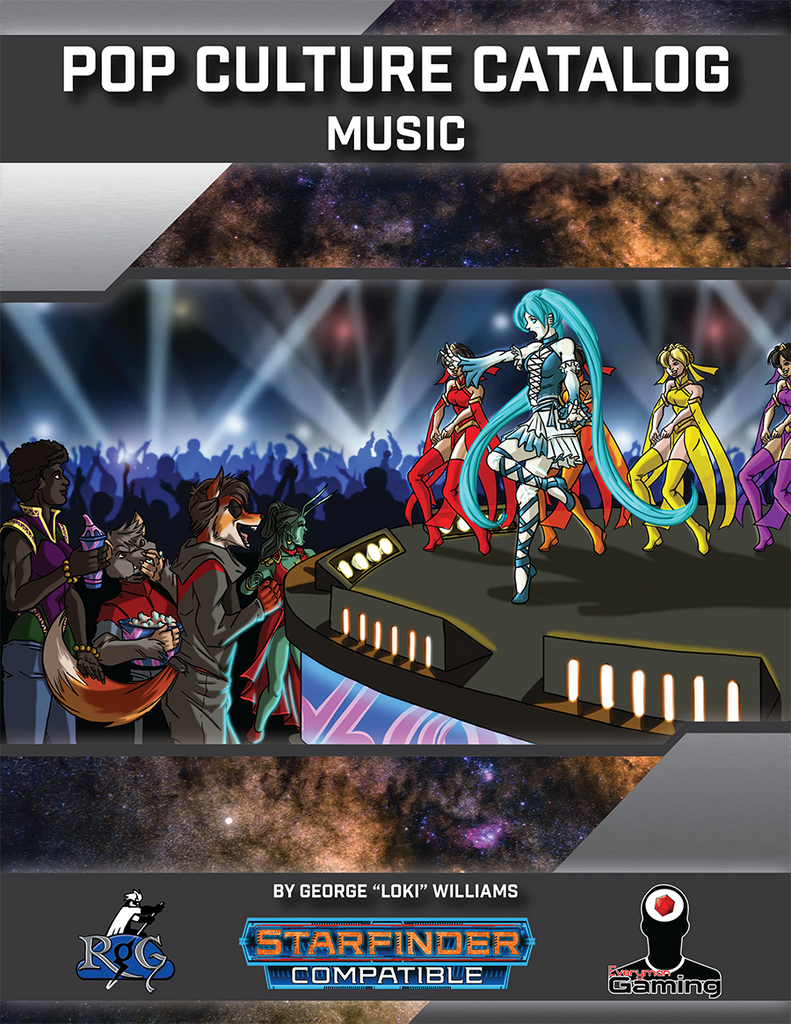 This installment of the Pop Culture Catalog includes: music! This behemoth of a product, weighing in at 25 pages, includes all the information you need to know about music genres and subgenres in the Blood Space Campaign Setting, as well as traditional music of a myriad of species and over 20 distinct bands, vocalists, instrumentalists, and record labels! Also included is a nifty guide for purchasing useful music equipment.