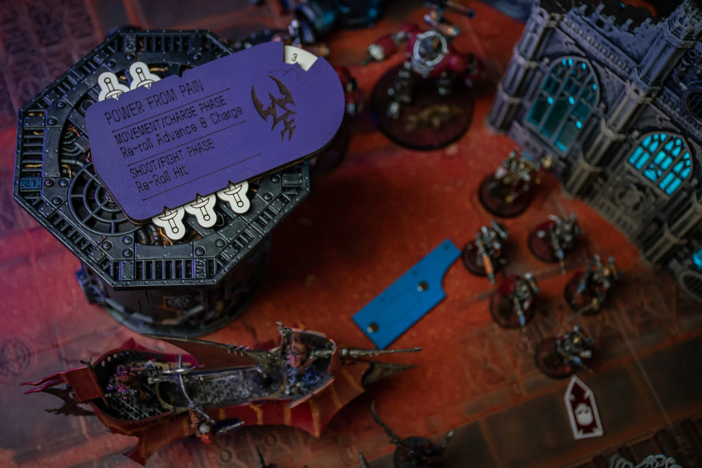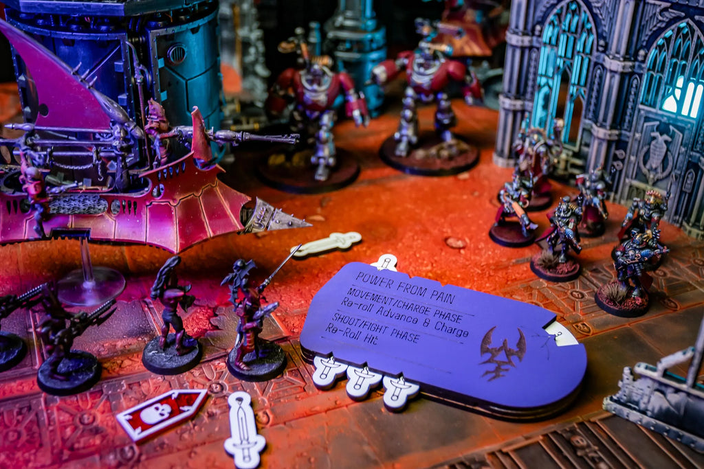 Perfect for competitive play where clear ability tracking is essential, or narrative games where you want to emphasize the dark theme of Drukhari feeding on suffering. The tracker keeps your Power from Pain mechanics organized and visible, letting you focus on tactical deployment of your enhanced units rather than bookkeeping.