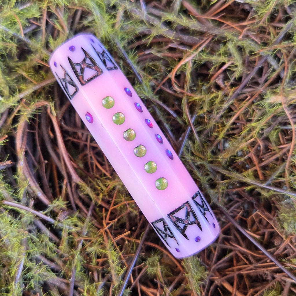 This unique D10 features eldritch font numbering and an eye on one side that is magnified when you look through the other side of the die - a truly captivating optical effect! Completely clear resin is accented with opal colorshifting rainbow flakes and paint flakes. Numbered sides are frosted for contrast instead of clear like glass.