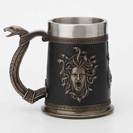 No matter if you love to collect unique drinking vessel or items based on Greek mythology, you should look at the Screaming Medusa Beer Stein. Made from cold cast bronze, this handcrafted stein depicts the face of Medusa on the black sides. Her hair of snakes sits around her face. Her mouth is wide open in a scream pose revealing her fangs. Between the two depictions of her face, there is a sword going through a shield. The shield has a lion face, referencing the myth. At the top and bottom of the decorations, there are Greek borders. Next, the hand-painted stein has a snake handle. Leaf patterns appear to restrain the snake. Finally, this stein has a stainless-steel insert. This insert makes the vessel safe for drinking. Add the Screaming Medusa Beer Stein to your drinkware collection or decor. It looks great in any home or office.