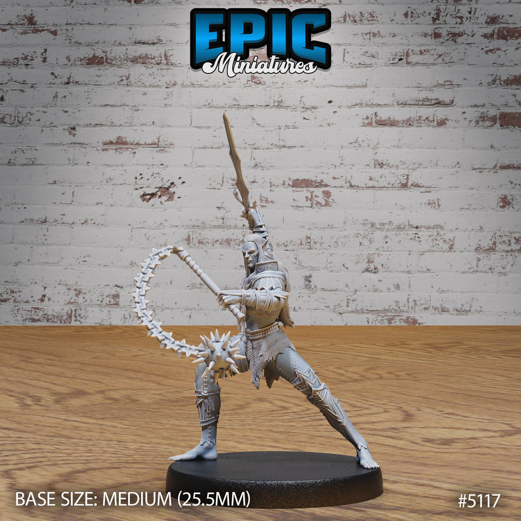 The Slave Half-Drow Master is a ruthless overseer clad in spiked armor and chains, wielding both sword and flail with brutal efficiency. This set includes variants standing in command, mid-attack, and sneaking forward. Perfect for Dungeons & Dragons, Pathfinder, or Warhammer campaigns as a dark elf enforcer.