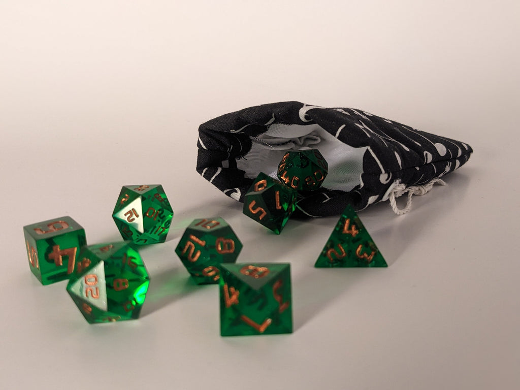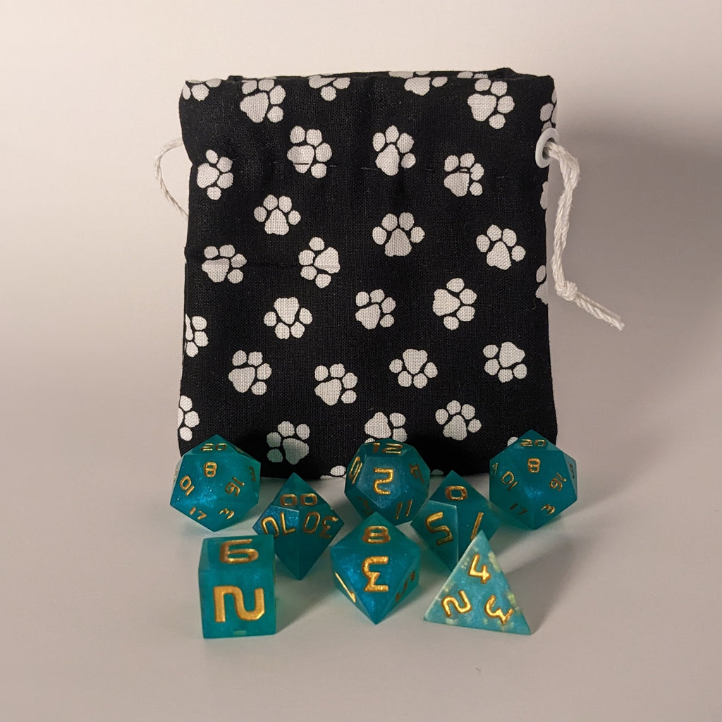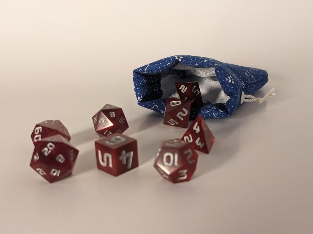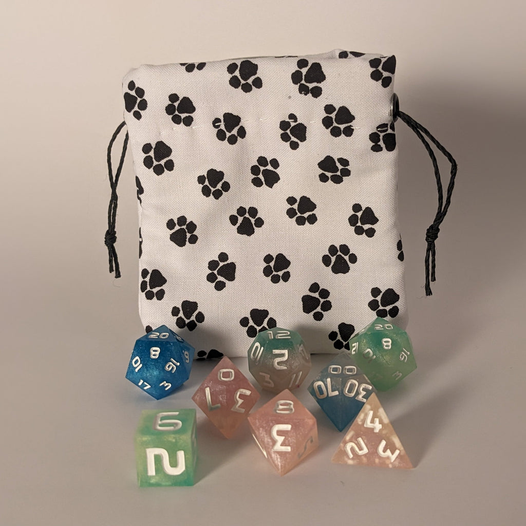 Keep your dice safe and stylish with our handcrafted dice bags! Each bag is carefully made with a drawstring closure to secure your treasures, a soft lined interior to protect your dice, and dimensions of 4.5 inches tall by 3.5 inches wide—perfectly sized for your favorite sets. Choose from a variety of designs, including unique, one-of-a-kind options that won't be restocked. These bags combine function with flair, making them a must-have for any tabletop gamer.