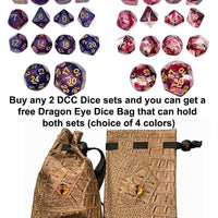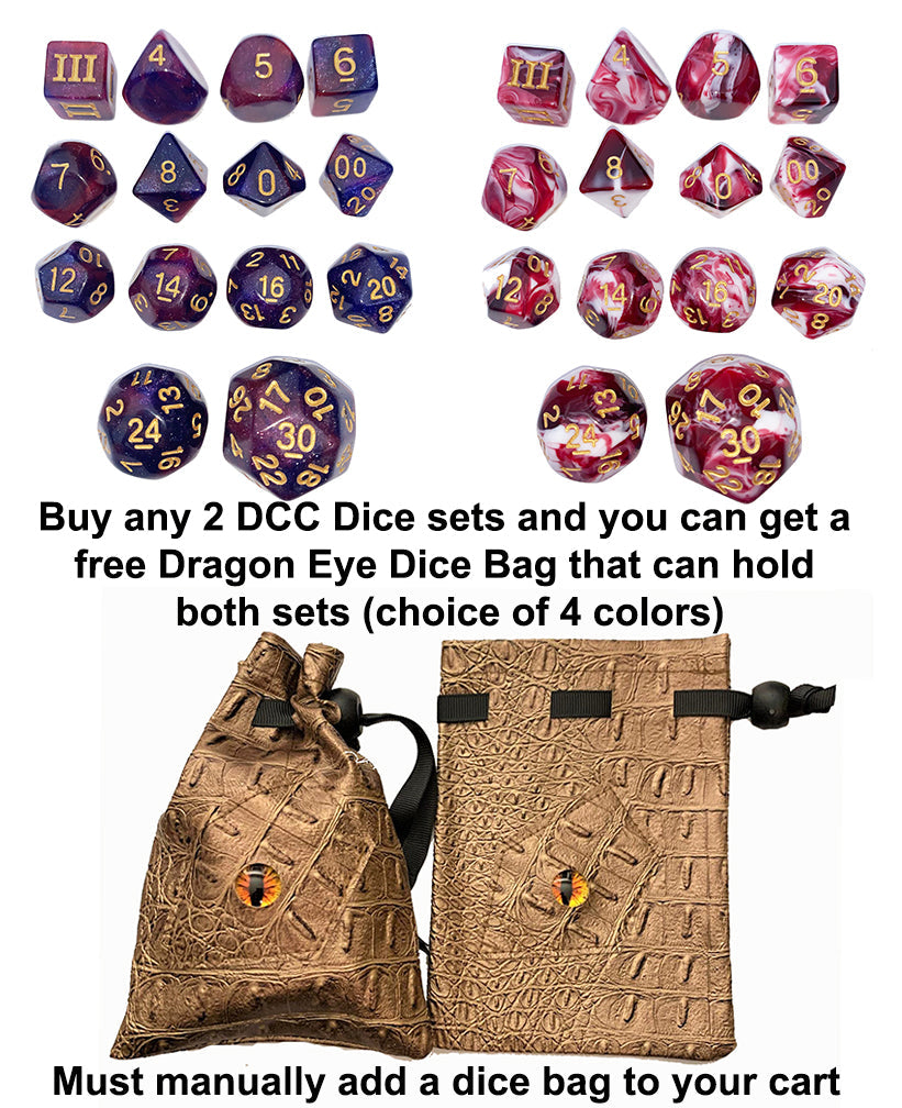 Buy any 2 Specialty DCC Dice sets and you can get a free Dragon Eye Dice Bag that can hold both sets. (choice of 4 colors)
