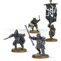 This boxed set contains a set of Morannon Orc Commanders. These models are resin cast miniatures, including an Orc Captain, a Drummer, a banner bearer, and a Morannon Orc Shaman. They are supplied as 8 separate components, and come with 4 25mm round bases.