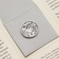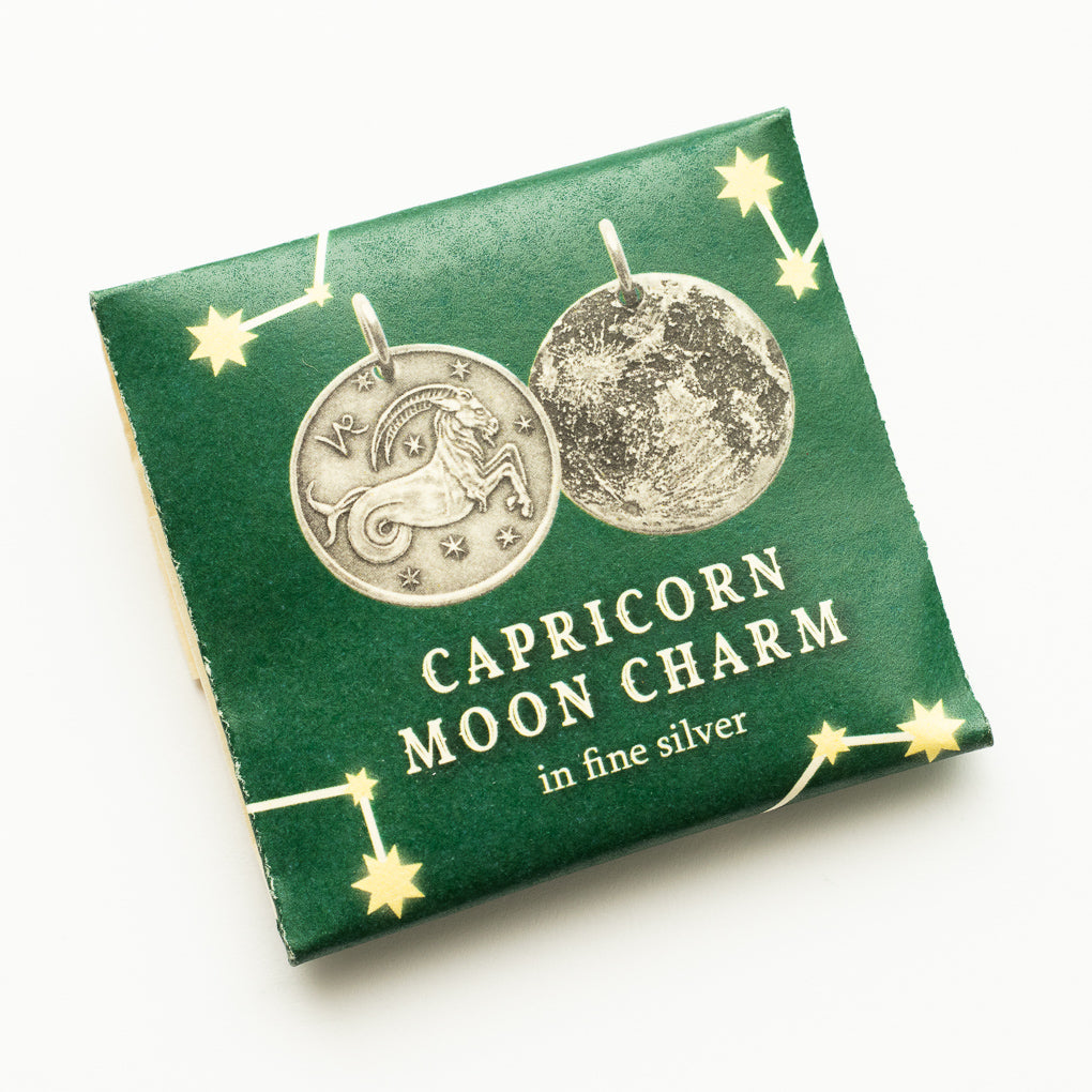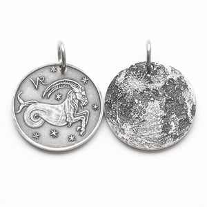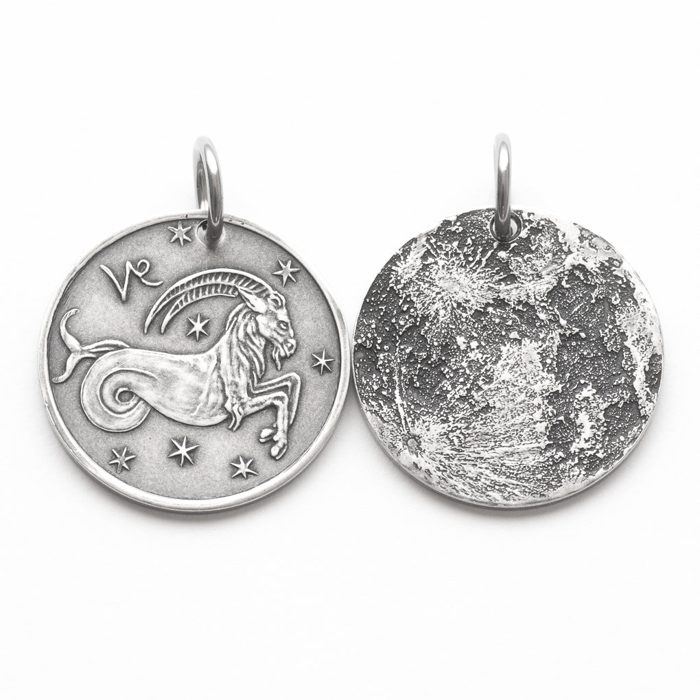This Capricorn Silver Moon features a sea goat surrounded by stars and the Capricorn symbol ♑