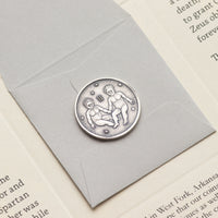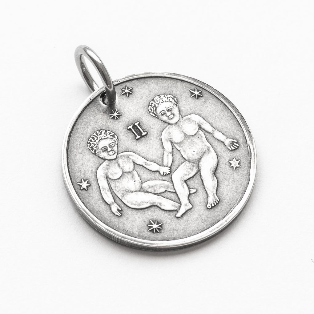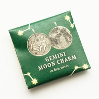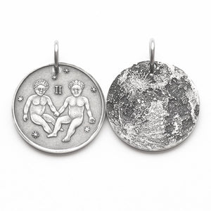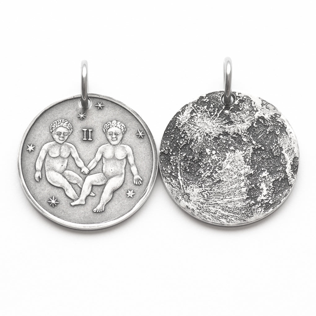 This Gemini Silver Moon features a pair of twins surrounded by stars and the Gemini symbol ♊