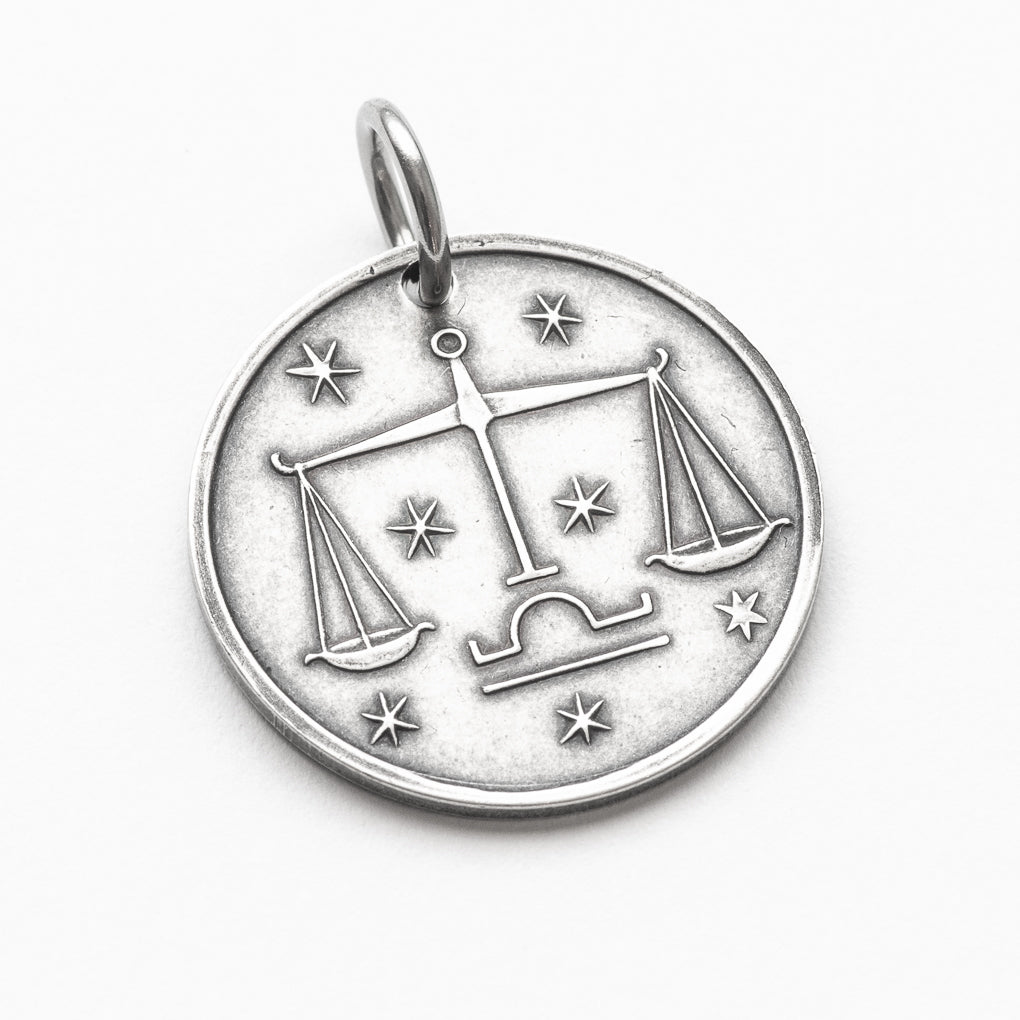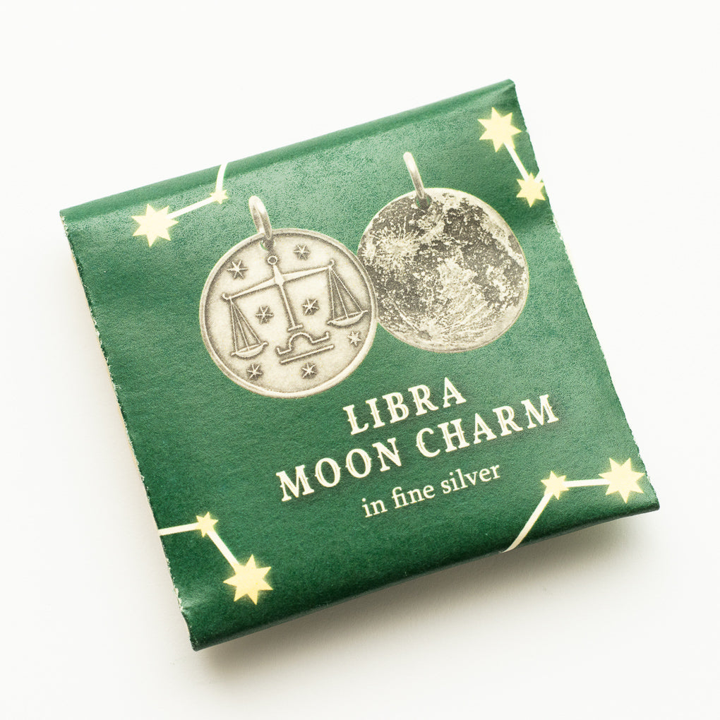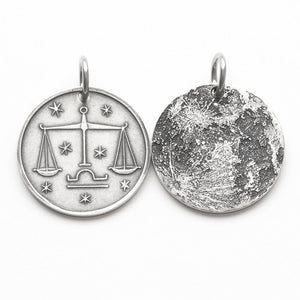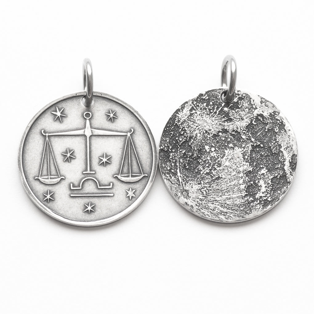 This Libra Silver Moon features balancing scales surrounded by stars and the Libra symbol ♎